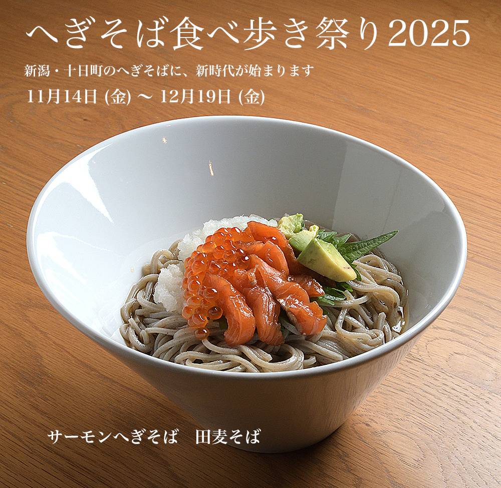 2025年11月14日からスタートした「へぎそば食べ歩き祭り2025」をプロデュースしました。「我が町を日本一のそば処にするプロジェクト」の一環です。日本各地の複数の自治体や個店から「我が町を日本一のそば処にするプロジェクト」について、お問い合わせをいただいています。日本そばの革命が、ここからすでに始まっています。下の写真をクリックすると、詳しい説明ページにリンクします。
